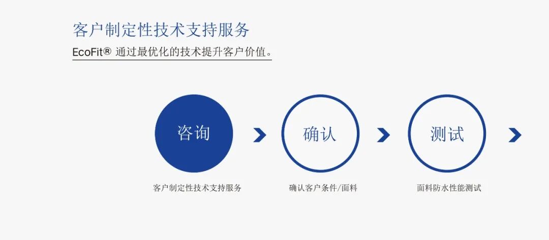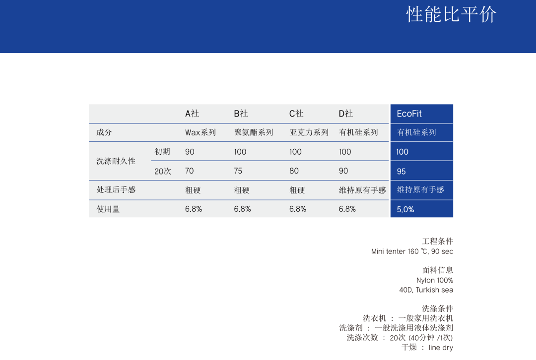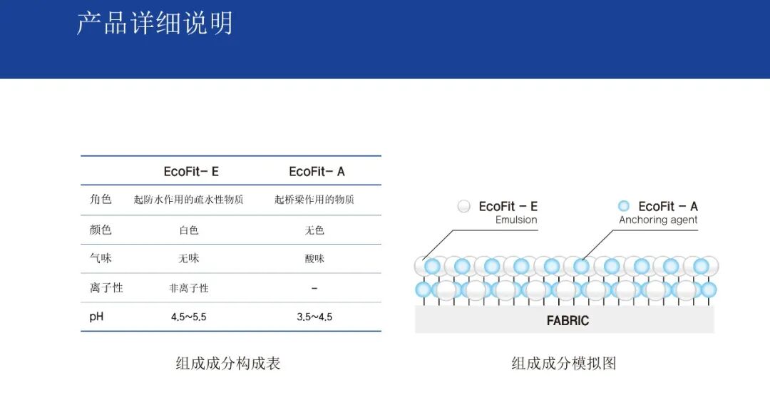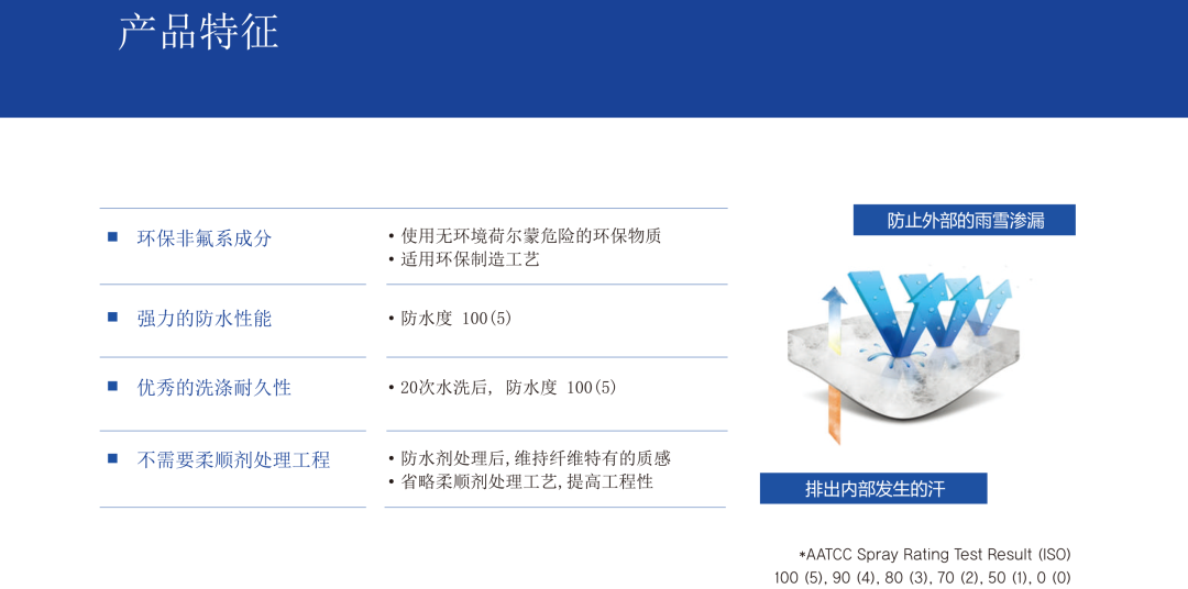 亲环境无氟系防水剂 此款防水是以人体无害非氟系有,无机混合型纳米复合高分子合成。 可防止环境污染,属新概念环保型防水剂。 可放心添加在纺织面料中。 EcoFit®以人体无害的非氟系有机和无机混合型纳米复合高分子合成,可防止环境污染,属于新概念环保型防水剂。 传统方式的氟系防水剂是对纤维表面进行改质,使水分子无法通过,然后新概念防水剂则渗入纤维深处并与纤维结合,从而最小化防水剂的损失,是具有优秀的洗涤性能的产品。 产品特性: +无氟系有.无机高分子乳液。 +使用环保制造工法及环保材料。 +不需要柔顺剂处理工程。 +优秀的洗涤耐久性。 +优秀的保管稳定性。 +获得TESTEX ECO-PASSPORT 产品特征 环保非氟系成分:使用无环境荷尔蒙危险的环保物质,适合环保制造工艺 强力的防水性能:防水度100(5) 优秀的洗涤耐久性:20次水洗后,防水度(5) 不需要柔顺剂处理工程:防水剂处理后,维持纤维特原有的质感 省略柔顺剂处理工艺,提高工程性 洗涤条件: 一般家用洗衣机 一般洗涤用液体洗涤液 20次(40分钟/1次) 干燥:Iine dry 应用领域: 可适用于棉、涤纶尼龙等多种面料。 可以对可使用的面料及使用方法进行咨询。 工程条件: Mini tenter 160°C.90sec. 面料信息: Nylon 100%.40D.Tukish sea. 可按客户需求定制: